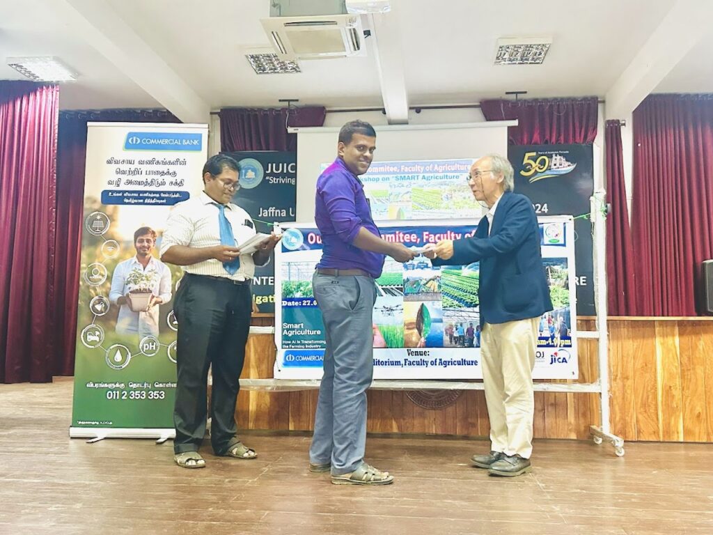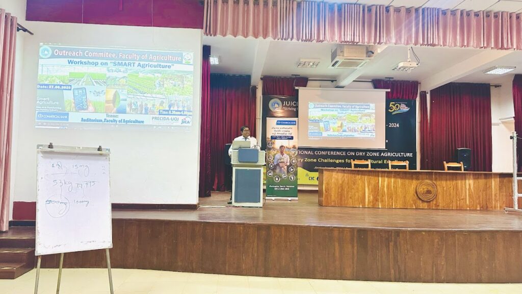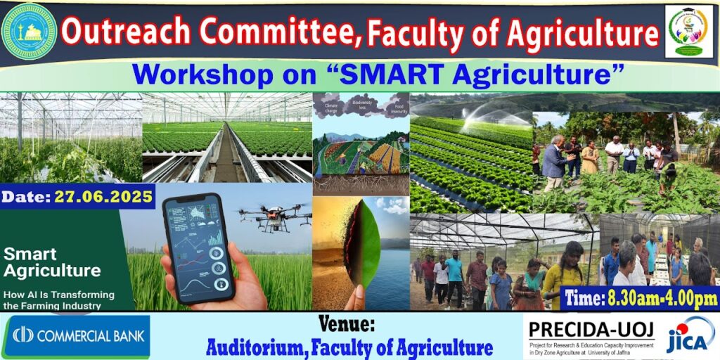 The Outreach Committee of the Faculty of Agriculture organized an workshop on SMART Agriculture with the sponsorship of JICA PRECIDA – UOJ, in collaboration with Sri Lanka and Commercial Bank PLC on June 27, 2025, at the main auditorium of the Faculty of Agriculture, Ariviyal Nagar; Farm units and Kilinochchi from 8.30 am – 4.15 pm. Around 100 Agriculture instructors of Northern Sri Lanka (50), commercial Bank beneficiary farmers (25) and youths from Kilinochchi, Mannar and Mullaitivu (25) were participated.